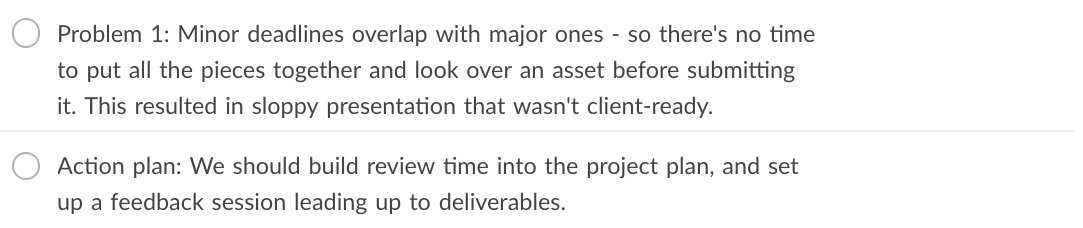 It’s not useful to say “Our project plan sucked.” Use the template to record the failure and solution as subtasks. An example might look like this:
