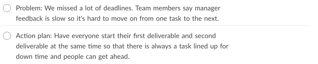 - Quality: How (will or did) tasks fail to meet delivery standards for quality?