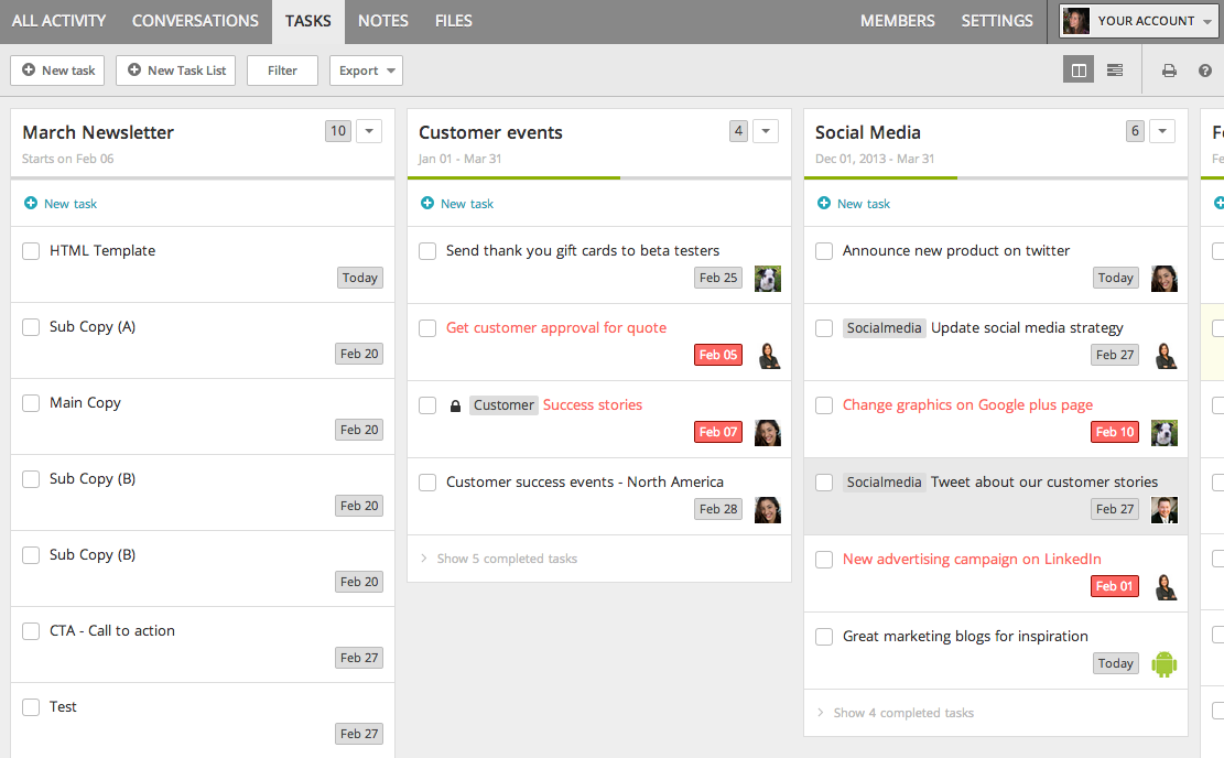 Lets go back to our freelancer example. If she is working independently on specific, concurrent projects for each client, naming each project after the client’s company name, and creating a task list (more on this later) for each individual deliverable is a good strategy. However, if she is working on two separate large projects for the client, with distinct working teams, it may be a better fit to name the projects after the client and the topic, so notifications can be more easily managed.